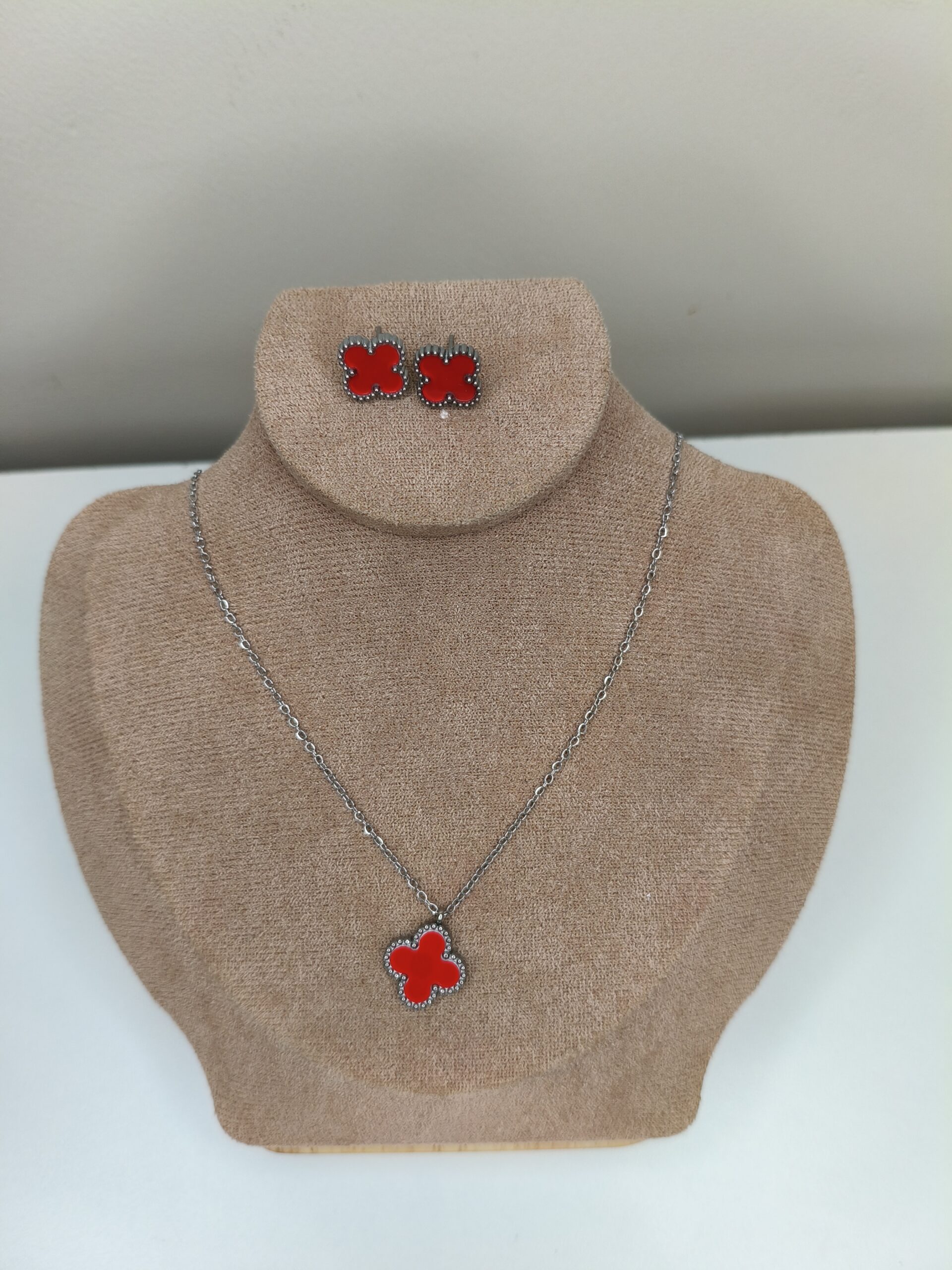 Conjunto Trevo Vermelho em Aço Cirúrgico – Colar e Brincos-LILLARA SEMIJOIAS